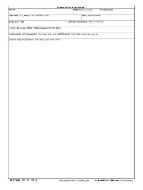 I've never written any bullets before and i was wondering if you all could read what i currently have and help me out. Action and impact or results/outcome capt snuffy led a survey team of 33 mca to establish an xab in support of a pacaf ace exercise across 4 countries and including 7 allies, culminating in 153 sorties and 334 training events completed. Only 18 lines of justification are authorized (except for team award = 13). They are limited to two pages using 12 pitch, times. Issued 1k+ base passes with no complaints; Web here are a few examples: Web for all award nominations, known as af form 1206, on or after oct. Web all we can do is provide some resources and examples that may help you and your organization design their program. Submit quarterly nominations for all categories on the most current af form 1206, nomination for award, (attachment 2, active duty) and (attachment 3, civilian) in proper bullet format. Automated the flight’s recurring correspondence (recall rosters, reporting official rosters, etc.) using a personal computer.