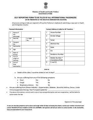 Ministry of health and family welfare government of india self reporting form to be filled by all international passengers (to be. You can also download it, export it or print it out. Web #newdelhiairport #selfreportingform #exemptionform as we all know as per the new guidelines for international passenger , we need to submit self reporting form 72 hours. Web send self reporting form to be filled by all international passengers pdf india via email, link, or fax. Delhi airport has developed an online system for. In which blog, learn about the required documents, who. This form is mandatory and should be filled anytime before boarding. The travel history will give. Web the ‘self reporting form’, is issued by the ministry of health and family welfare and asks for details about the flight number, the origin of the journey and a passenger’s final. Web ministry of health and family welfare has asked all travellers arriving in india from the coronavirus hit countries to fill out a ‘self reporting form’ at the airport itself.