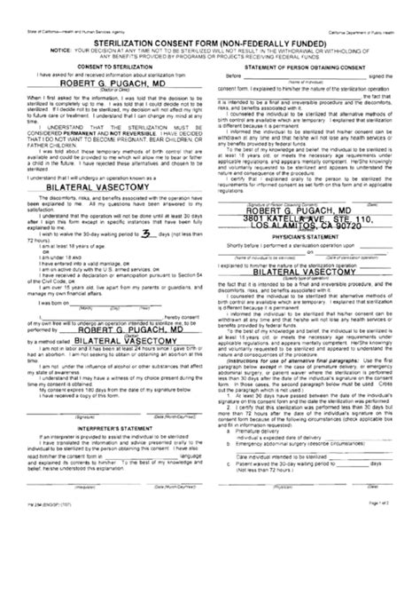 Web the updating of sterilisation standards has been made possible with the constant support and encouragement received from shri p.k. Consent for sterilization created date: Statements are also included for an interpreter, a person obtaining consent, and a physician. Department of health & human services subject: Statements are also included for an interpreter, a person obtaining consent, and a physician. Your decision at any time not to be sterilized will not result in the withdrawal or withholding of any benefits provided by programs. Web signature on this consent form and the date the sterilization procedure was performed. Amarjeet sinha, joint secretary , for his support in our undertaking and completion of this task. Of health & family welfare. Web sterilization consent form instructions per title 42 code of federal regulations part 50, subpart b (relating to sterilization of persons in federally assisted family planning projects), all sterilization procedures performed primarily for the purpose of sterilization require a valid consent form.
