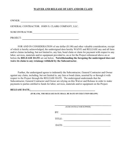 Subcontractor Release Form. Fill & download for free get form download the form the guide of filling out subcontractor release and waiver of liability online if you are looking about tailorize and create a subcontractor release and waiver of liability, here are the simple steps you need to follow: A lien waiver (or waiver of lien) is signed before a lien is ever filed, as it gives up one’s ability to file the lien.