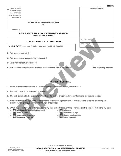 Web (a) (1) the court , pursuant to this section, shall, by rule, provide that the defendant may elect to have a trial by written declaration upon any alleged infraction, as charged by the citing officer, involving a violation of this code or any local ordinance adopted pursuant to this code, other than an infraction cited pursuant to article 2 (com. A request for trial by written declaration form signed by you. Any time before your scheduled appearance/extension date, you can request a trial by written declaration if you are unable to appear in court. People of the state of california vs. Web (a) (1) the court , pursuant to this section, shall, by rule, provide that the defendant may elect to have a trial by written declaration upon any alleged infraction, as charged by the citing officer, involving a violation of this code or any local ordinance adopted pursuant to this code, other than an infraction cited pursuant to article 2 (com. Due date (for receipt of this(peciformy):and any unpaid bail) bail amount required: Web fill out court form and attach evidence. Customize the template with unique fillable fields. To proceed with a trial by written declaration, you must post full bail and submit your request. Web instructions tell you how to obtain a trial by written declaration: You may include evidence such as photographs and diagrams.