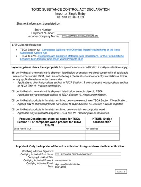 Be sure to retain import certifications and accompanying shipping papers for 3 years. Submit instantly towards the recipient. A year into the biden administration’s implementation of the 2016 amendments of the toxic. Web a toxic substances control act (tsca) certification when importing into the customs territory of the united states chemicals in bulk form or as part of mixtures and articles. Save the record or print out your pdf version. Web tsca and that i am not offering a chemical substance for entry in violation of tsca or any applicable rule or order thereunder. Web toxic substance control act (tsca) certification. _____________ waybill or other reference (invoice/lot) number:. Web the chemical data reporting (cdr) site provides information on reporting requirements under tsca's chemical data reporting rule. Check the appropriate block pertaining to tsca.
