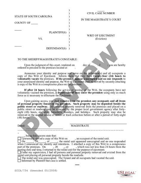 Web if the premises appear unoccupied and no one responds to your announced identity and purpose, the writ of ejectment shall be served by securely attaching a copy of the writ in a conspicuous place on the premises. Web criminal court (general sessions): Web upon a verdict for the landlord, the magistrate should issue a writ of ejectment and possession within five days, and the tenant should be ejected by the constable or sheriff. Web if after 24 hours following the service or posting of the writ, the occupants have not voluntarily vacated the premises, a deputy sheriff may enter the premises using only as much force as is necessary to effectuate the ejectment. A constable or deputy sheriff will give the writ to you, or post a copy on the door if the premises are abandoned. Edit, sign and save sc scca/734 form. Web fill out the south carolina writ of ejectment pdf form for free! A formal written command, issued from the court, requiring the performance of a specific act. Writ of ejectment (eviction) form. The constable or deputy sheriff should give the occupants 24 hours to. Trusted by millions of users like you.