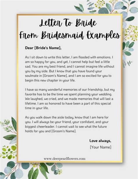 Letters To The Bride Examples. Web examples of letter to the bride from bridesmaid. Here are some examples of a letter to the bride from a bridesmaid:.