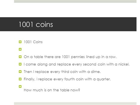 On a table there are 1001 pennies lined up in a row. I come along and replace. There are 1001 pennies lined up on a table. 1001 pennies there are 1001 pennies lined up on a table. On a table there are 1001 pennies lined up in a row. I come along and replace every second coin with a nickel. I come along and replace every second coinâ with a nickel.