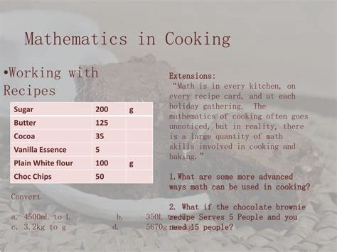 Ingredients must be measured and scaled accurately, food production. Web cooking requires a precise measurement of ingredients, temperature, and time, which makes math an important aspect of cooking. Web culinary math begins with the basics of addition, subtraction, multiplication, and division along with ratios, yields, and percentages. Web in this article, we will explore some of the ways that mathematics can help us in the kitchen, especially with the various unit conversions, measurements, ratio math and other calculations one encounters. Web to work out how long you have to cook something, the formula is cooking time in minutes = 15 + ( (mass in grams ÷ 500) x 25). Ingredients must be measured and scaled accurately, food production. For example, if you have a chicken that weighs 2.8 kg, the calculation. Web culinary maths is taught in culinary school, so chefs can apply basic maths like addition and multiplication to make simple to complex calculations when measuring ingredients, portion sizing, menu costing. From measuring ingredients to calculating cooking time, the use of math in cooking.
