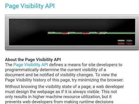 Page Visibility Api. Web learn how to use the page visibility api, an api that lets you know when a page is visible to the user, and how to. With tabbed browsing, there is a.