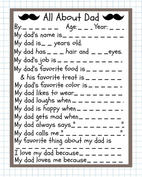 To get started, just click the links below for your. Web dad will love hearing all the things they have to say about him and it can be an easy keepsake to tuck into an album and look back on years from now. Web this adorable, printable dad questionnaire has a place for them to color and draw their dad’s face and hair. Have your kids fill out the answers and you've got a sweet father's day keepsake that he'll love. This version of the father’s day questionnaire has the heading “all about dad” in letter outlines so kids can color them. It also has an outline of a man for kids to be able to draw a face. Web all about dad. Then, have them (or you, if they are too little) fill in the blanks in their own words. Web try this free, printable questionnaire. Download our free father’s day. Looking for a simple but special father’s day gift from the kids?