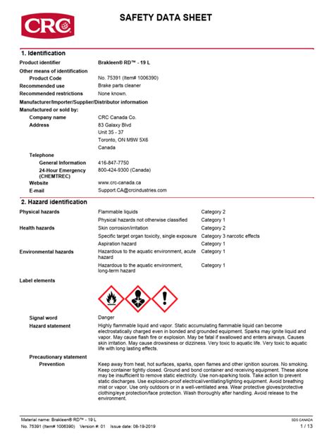 Crc Brakleen Safety Data Sheet. Web category 1 signal word hazard statement danger extremely flammable aerosol.