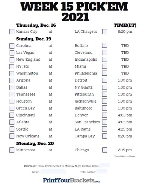 Tiebreaker:total points scored in monday. Web week 15 pick sheet thursday, dec. Web try our week 15 picks master sheet where you can combine all of your participant's picks onto one sheet!