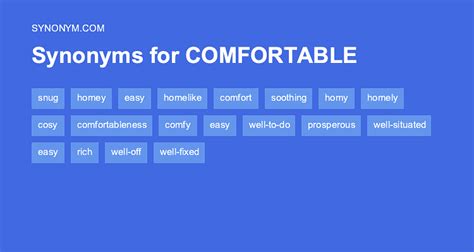 Comfortable, cozy, snug, easy, restful mean enjoying or providing a position of contentment and security. Comfortable, snug, soft, easy, cozy, spacious, cushy, relaxing; Relief, consolation, encouragement, solace, reassurance, cheer, sympathy, happiness; Here's a list of similar words from our thesaurus that you can. Comfortable, relaxed, comfy, snug, at ease, warm, resting, satisfied; Distress, anguish, torture, cold comfort, heartache, heartbreak, torment, weight Web choose the right synonym for comfortable. Complacent, enjoyable, serene, satisfying, useful, and cozy. On this page you'll find 161 synonyms, antonyms, and words related to comfortable, such as: Uncomfortable, hard, severe, harsh, unpleasant, inhospitable, uninviting, dissatisfied
