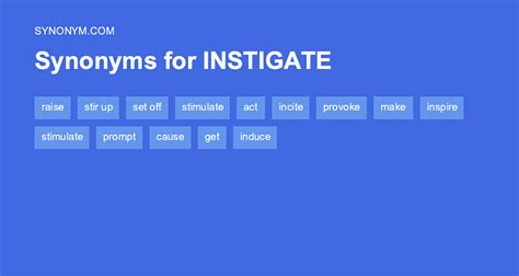 # stimulate , stir incite v. Web find 1,647 synonyms for instigates and other similar words that you can use instead based on 10 separate contexts from our thesaurus. Web find 2,089 synonyms for instigate and other similar words that you can use instead based on 8 separate contexts from our thesaurus. Instigate is an official word in scrabble with 10 points. # excite , prompt prompt v. Provoked, triggered, promoted, encouraged, raised, incited, fomented, abetted; Instigate definitely implies responsibility for initiating another's action and often connotes underhandedness or evil intention. Incite stresses a stirring up and urging on, and may or may not imply initiating. Excitement, encouragement, stimulus, motivation, stimulation, provocation, incitement, incentive; Incite, instigate, abet, foment mean to spur to action.