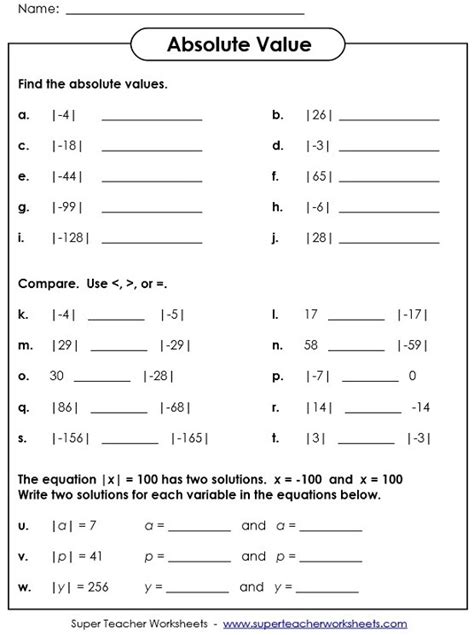 Absolute Value Worksheets Pdf. Purpose the purpose of this lesson is to solidify understanding of absolute value. All absolute value worksheets absolute value and opposite numbers comparing absolute value solving absolute value equations more related resources absolute value.