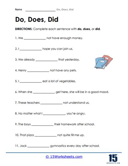 Simple past tense by ms. Some of the worksheets for this concept are do does and did work, do does dont doesnt, work,. Use do with plural subjects and i in the simple present. Web worksheet 1 do, does, did the verb to do: Web this worksheet is designed to help students practice forming questions that begin with do and does. Use ‘do’ and ‘does’ in the simple. Do, does, did add to my workbooks (68). In the present tense, do takes the form do or does, depending on the subject: Web the case concerns an evangelical christian who claimed the u.s. She understand the importance of working hard?